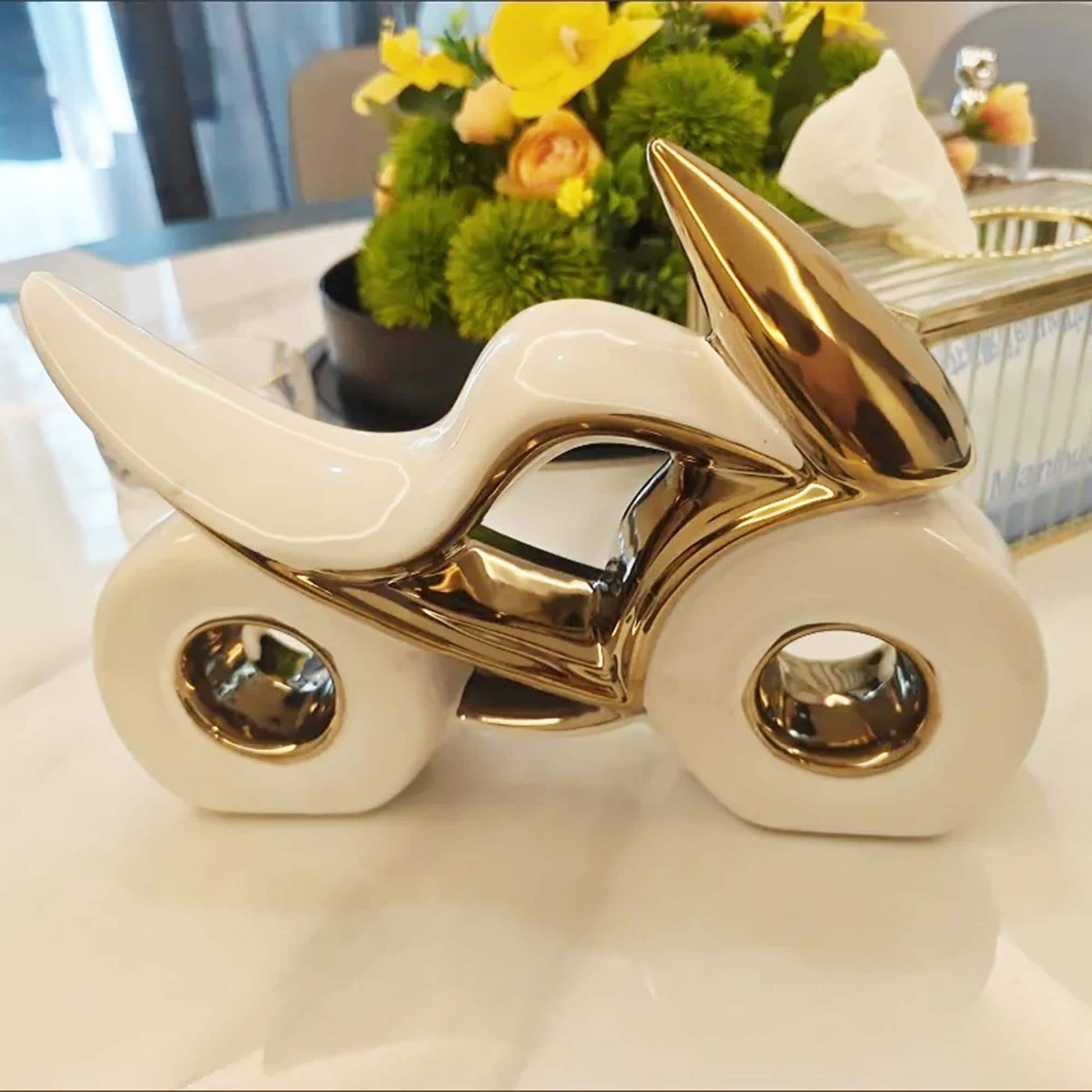 Elevate your space with our stunning Ceramic Motorcycle Sculpture! Crafted with exquisite attention to detail, this piece blends sleek, modern design with artistic flair. Available in elegant color combinations like white and gold, black and gold, or black and silver, each sculpture boasts a glossy finish that catches the light beautifully.