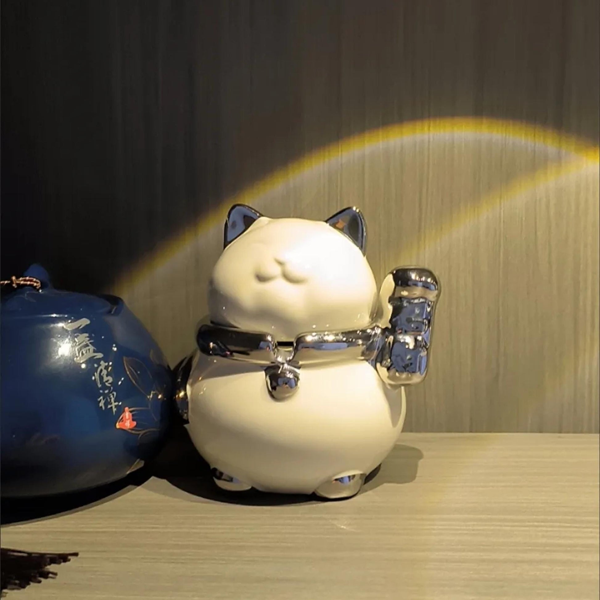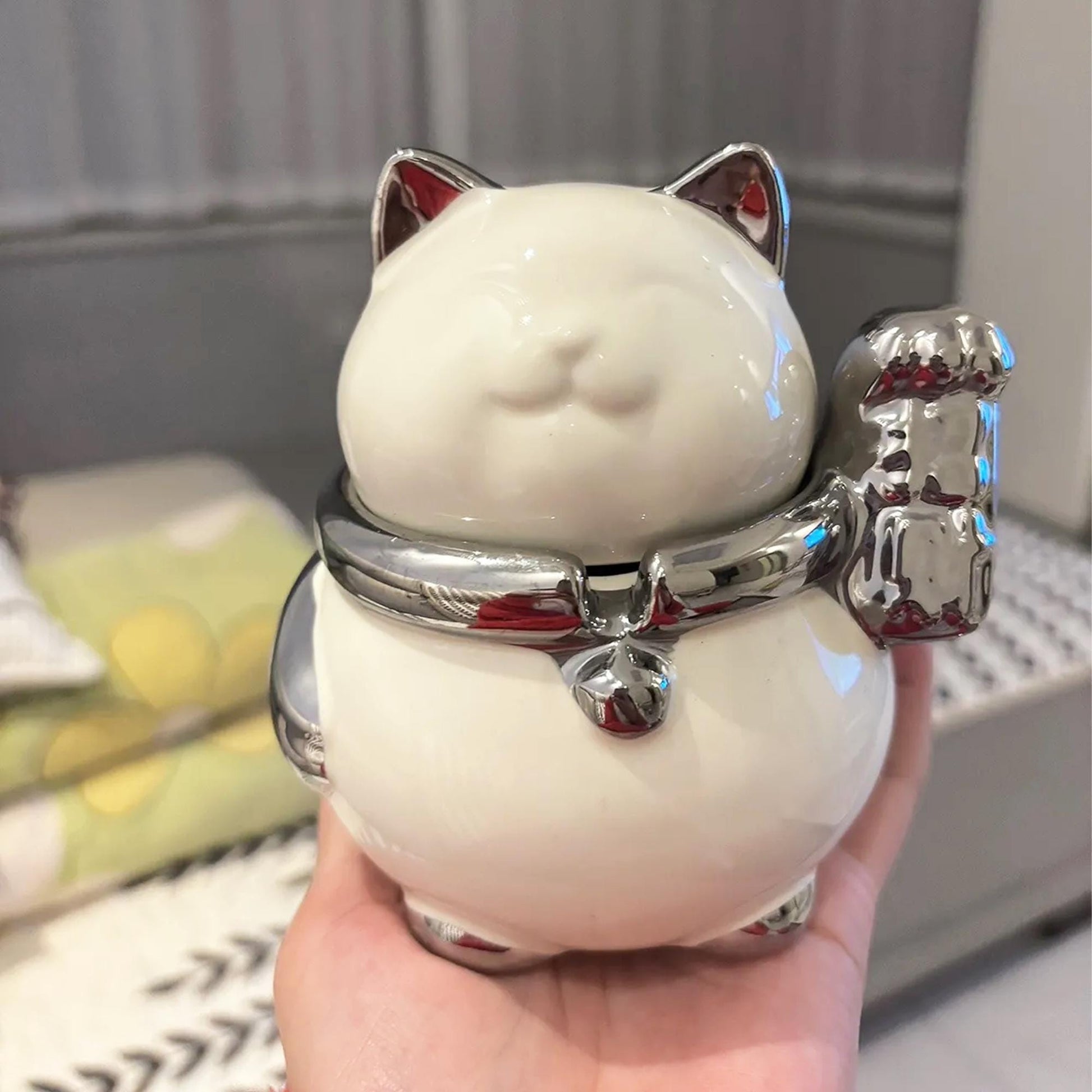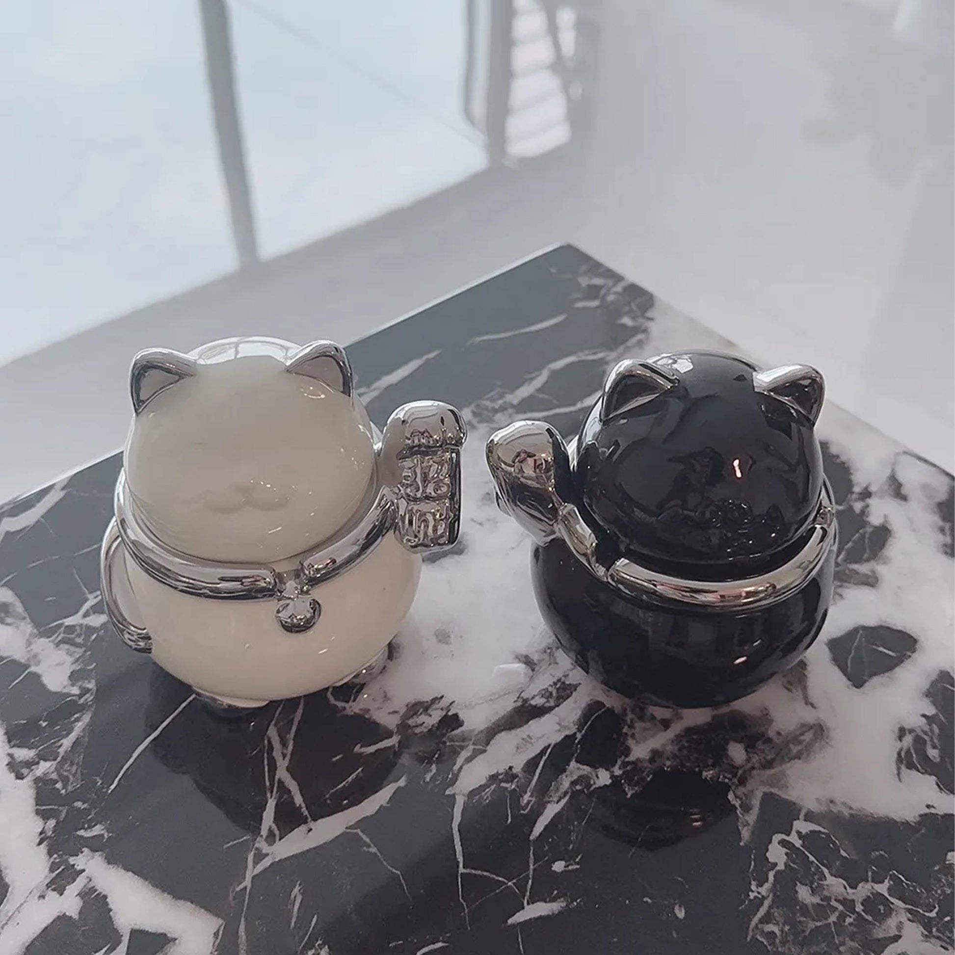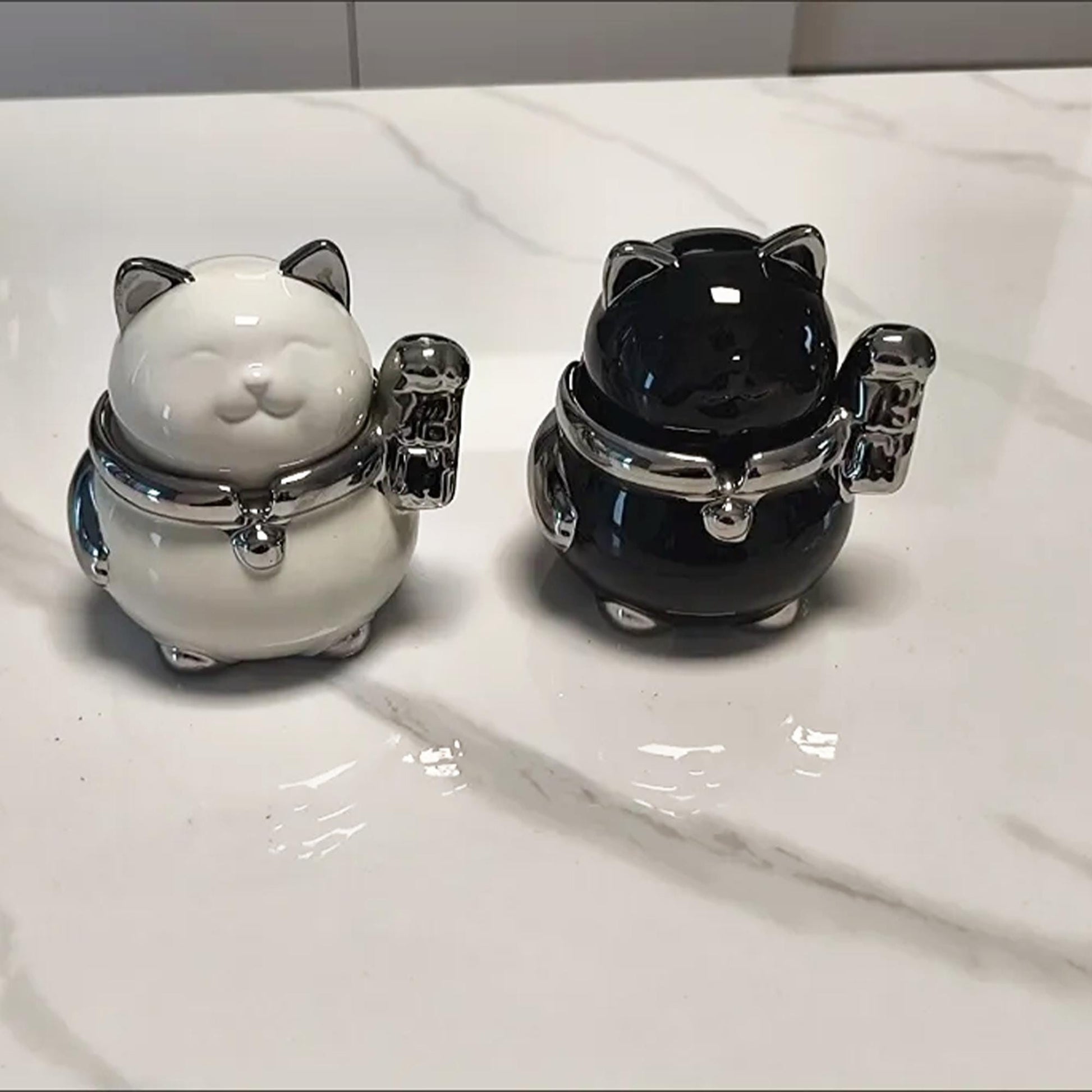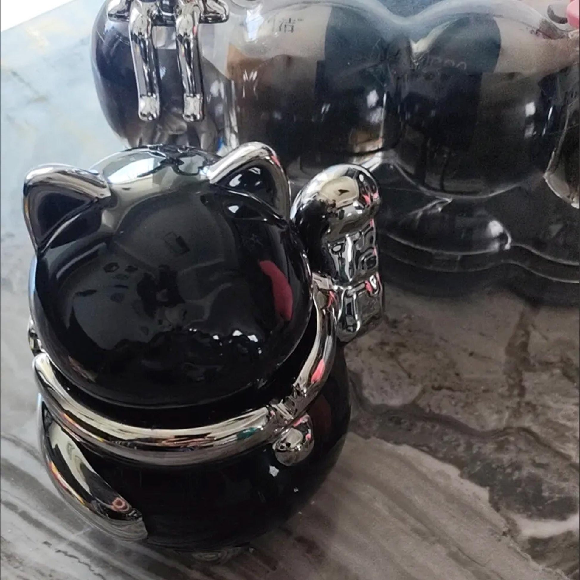 Crafted from smooth glossy ceramic with shiny metallic accents (collar, paw, bell—total cuteness!), it’s equal parts functional and whimsical. The lift-off cat-head lid contains ash (no messy odors!) and doubles as a tiny tray. Available in sleek black or creamy white, this plump lucky cat isn’t just an ashtray—it’s a quirky decor piece for your living room, office, or bar cart.