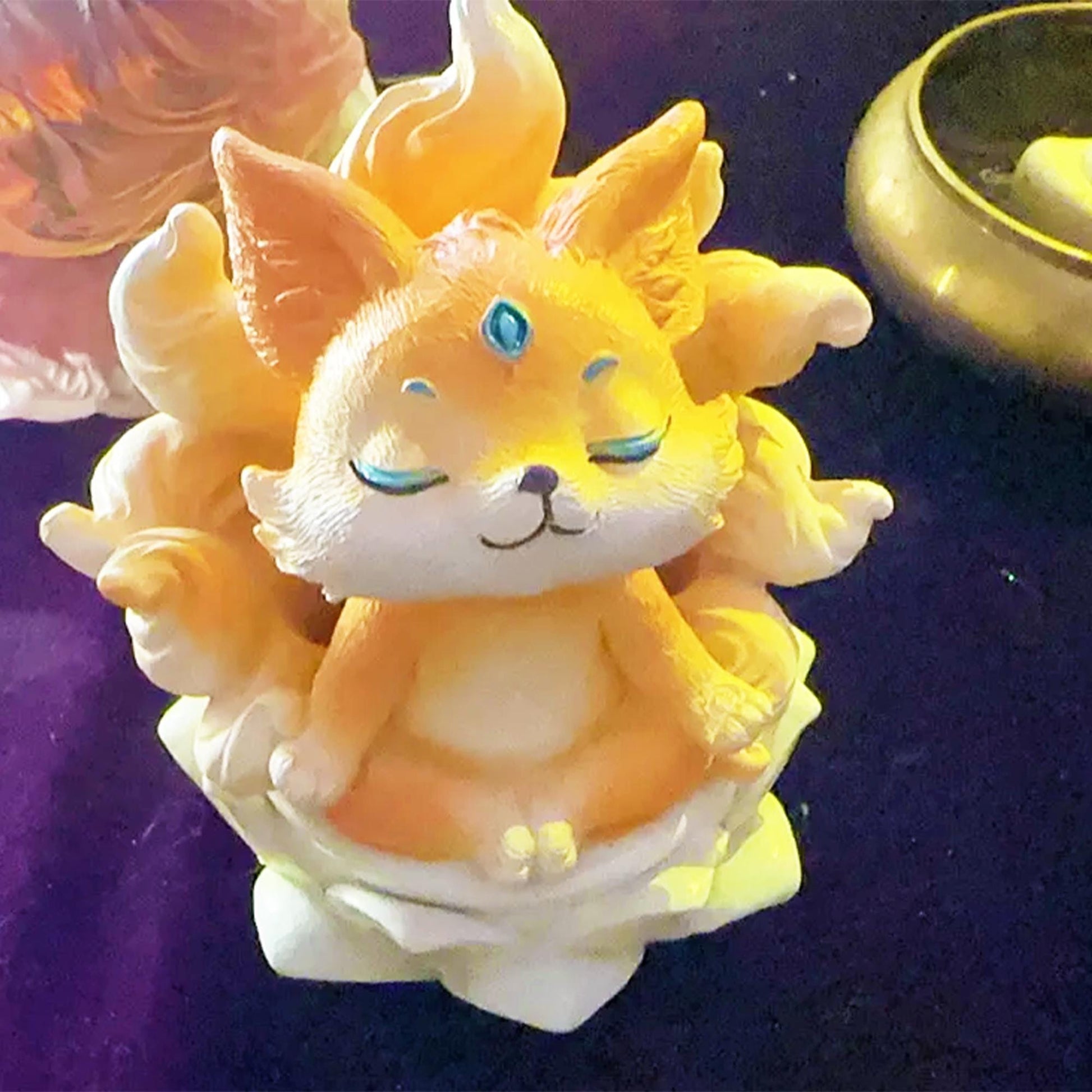 Mythical + Meditative Design: The fox sits in a peaceful lotus pose (a nod to enlightenment/purity), with gracefully curled tails and a shimmering gem on its forehead. It feels like a little guardian of calm, perfect for grounding your space.