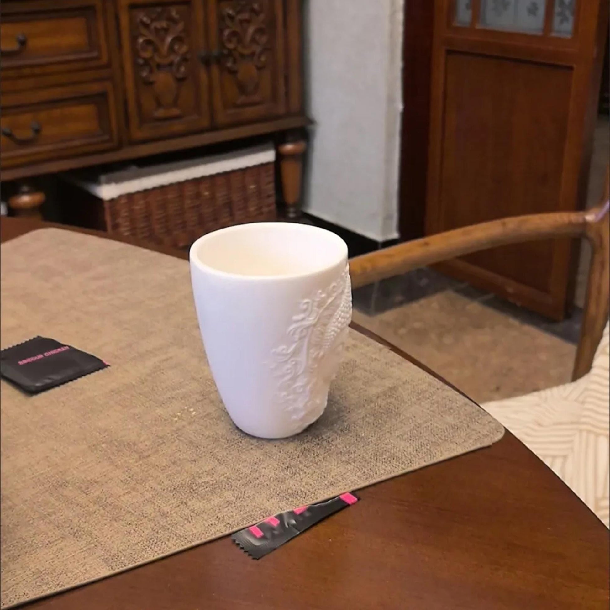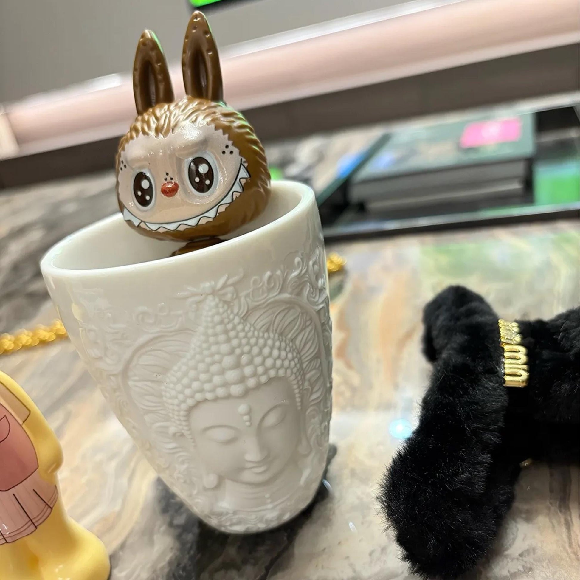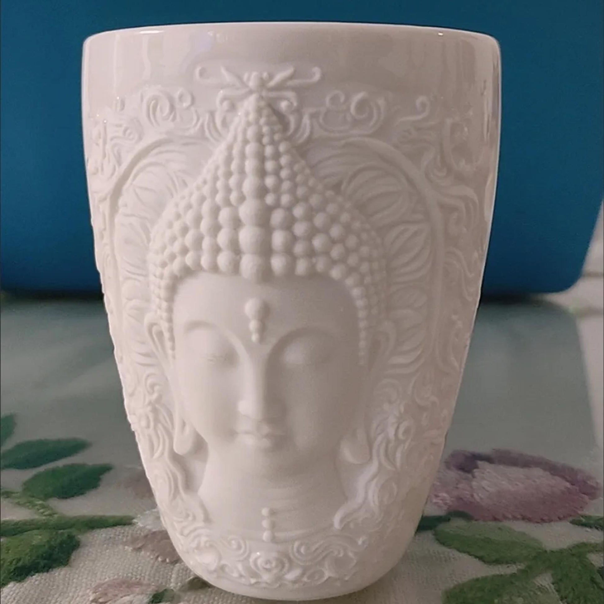 Made from smooth, high-quality white porcelain, every detail (the intricate spiral crown, soft tranquil expression, and delicate scrollwork surrounding the Buddha head) is meticulously carved. The glossy, sleek surface feels luxurious in hand; when light hits, the porcelain’s subtle translucency glows gently, wrapping your coffee/tea moments in quiet ambiance.