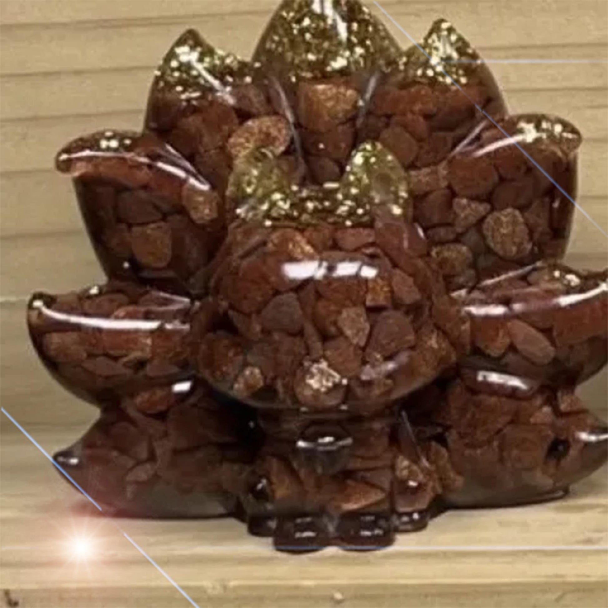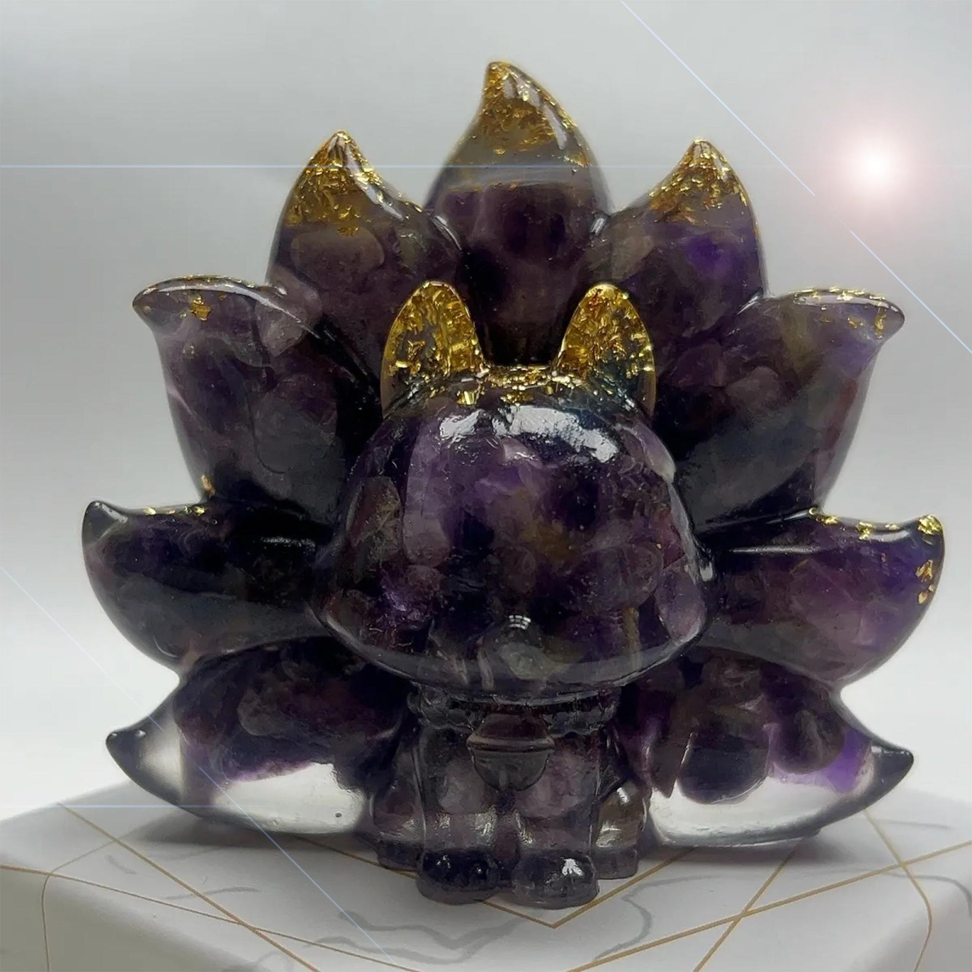 Meet your whimsical spirit companion: our Handmade Crystal Fox Statue!Handcrafted with crushed crystals (rose quartz, amethyst, citrine & more) sealed in glossy resin, this cute nine-tailed fox features shimmering gold accents on ears/tail tips.