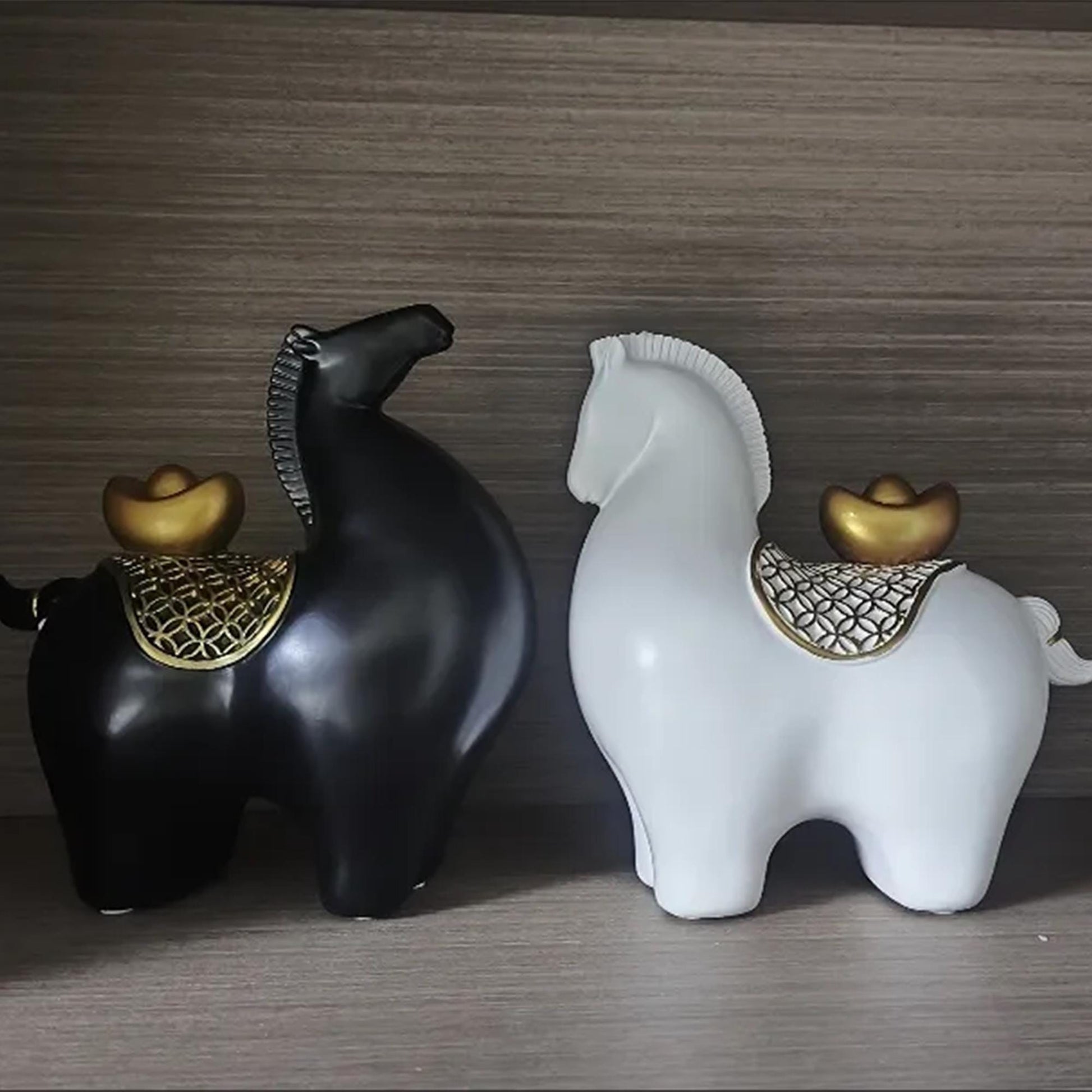 Crafted with a sleek, curved horse silhouette (available in crisp White, bold Black, or rich Teal), this sculpture features eyecatching gold accents: a detailed latticepatterned saddle and a gleaming gold ingot (a traditional symbol of prosperity in many cultures! Paired with the horse, it represents "immediate wealth"—the playful, lucky meaning behind this fanfavorite piece).